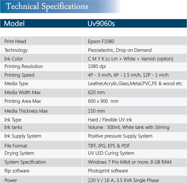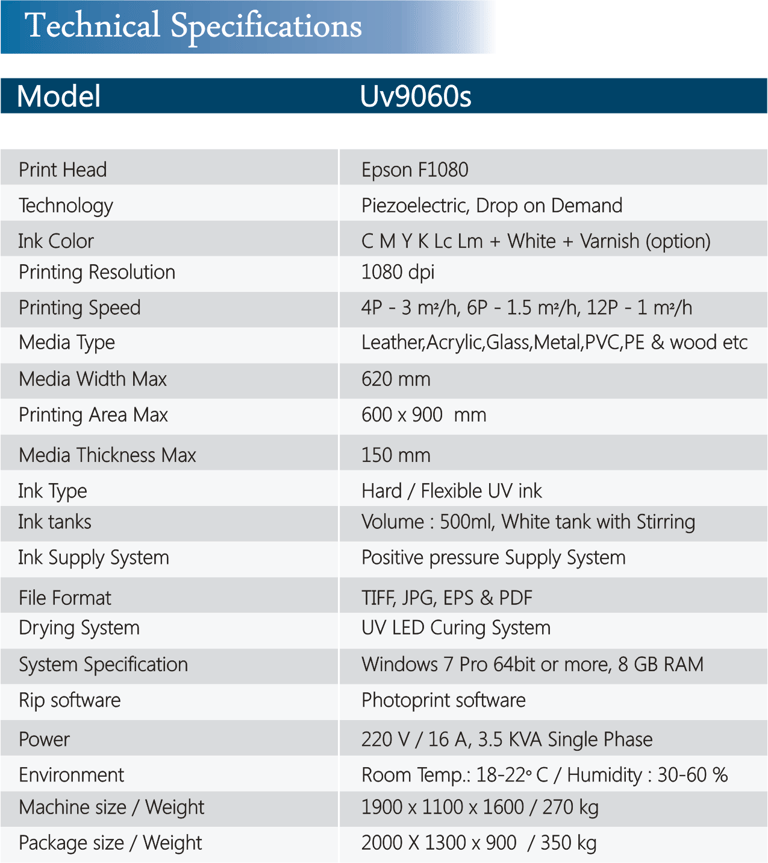 The MYCOLOR UV9060 F1080 UV Flatbed Printer is a high-precision digital printing solution designed for businesses seeking vibrant, durable, and versatile printing capabilities. With a 900mm x 600mm print area, it supports direct printing on a variety of materials, including acrylic, glass, metal, wood, PVC, and leather. Equipped with the Epson F1080 printhead, this printer delivers CMYK+W+V ink configuration, ensuring rich colors, sharp details, and the ability to add white and varnish layers for stunning effects. Its LED UV curing technology enables instant drying and long-lasting adhesion, making it ideal for personalized gifts, signage, promotional products, and industrial applications.
